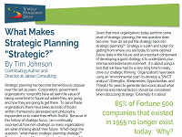 By Tim JohnsonGiven that most organizations today perform some level of strategic planning, the real question becomes, “How do we put the strategy back into strategic planning?” This whitepaper discusses five steps to take during a strategic planning effort.